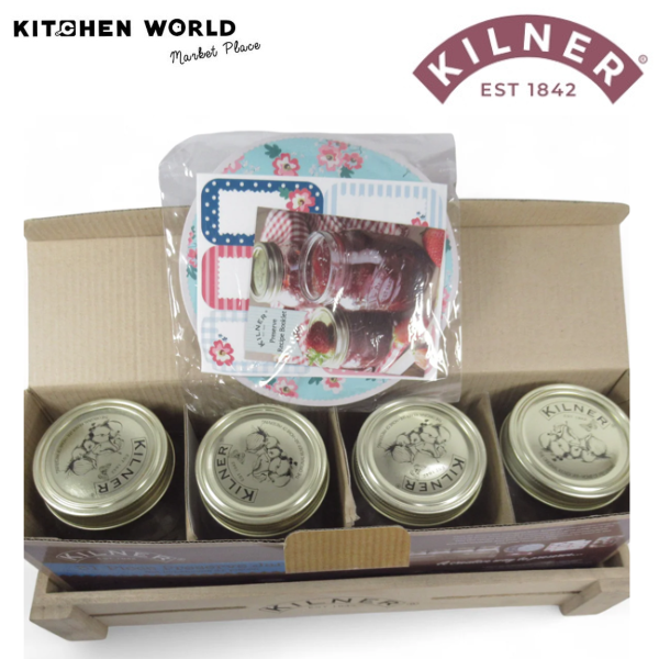 Set contains: 4 x Kilner 0.5 Litre preserve jars 1 x Wooden crate 27cm x 9cm x 6.5cm 12 x jar covers 12 x labels 1m co-ordinating ribbon 1 x recipe booklet