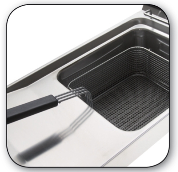 Electric fryer 13 liter, with pressed upper top 1,5 mm. heating elements from AISI 309, heat control 50-190°C, rotating heating elements, 1 robust basket 280x295 mm as standard.