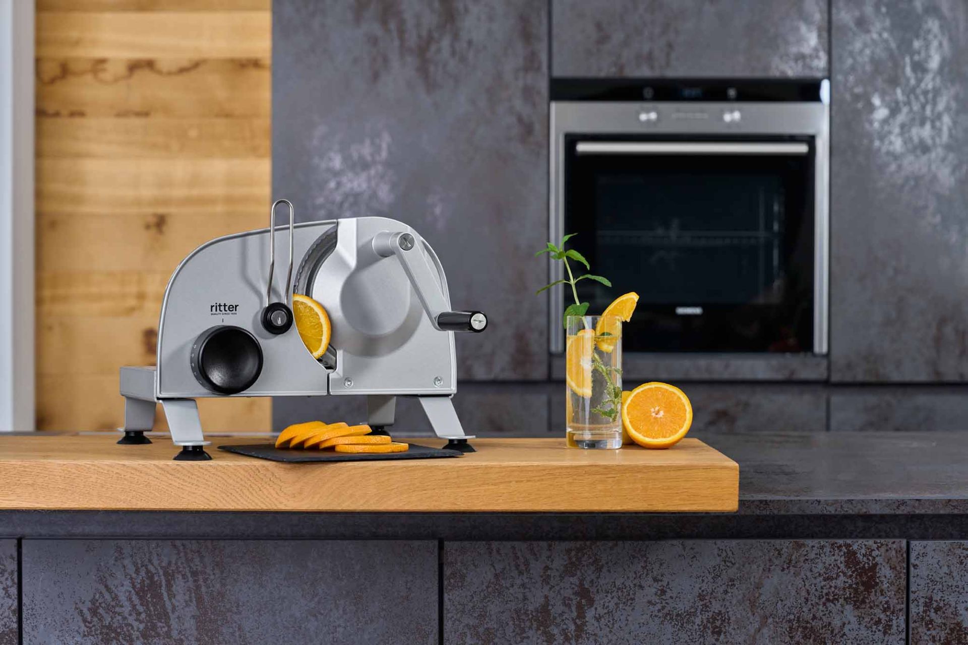 The hand-operated food slicer podio3 has a high degree of truth to material, is largely made of robust metal and, thanks to its timeless design, fits into practically any home.